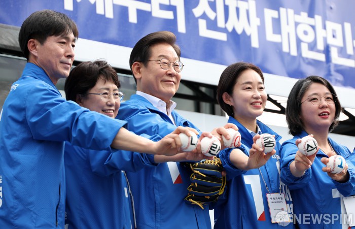 [서울=뉴스핌] 정일구 기자 = 이재명 더불어민주당 대선 후보가 29일 오후 서울 송파구 잠실야구장 앞 광장에서 열린 강동구·송파구 집중유세에서 '내란종식 1'이 새겨진 야구공 퍼포먼스를 하고 있다. 2025.05.29 mironj19@newspim.com
