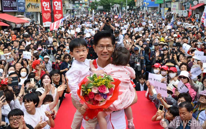 [군포=뉴스핌] 최지환 기자 = 김문수 국민의힘 대선 후보가 29일 경기도 군포시 산본역 로데오거리 원형광장에서 열린 유세에서 어린이들을 안아주며 지지를 호소하고 있다. 2025.05.29 choipix16@newspim.com