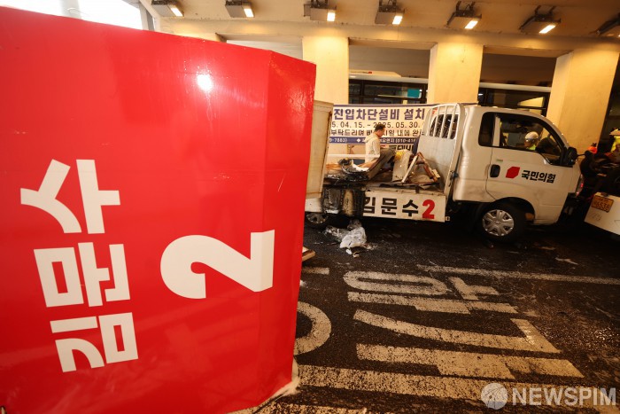 [서울=뉴스핌] 김학선 기자 = 김문수 국민의힘 대선 후보의 유세 차량이 30일 서울 용산구 숙대입구 인근 갈월지하차도 입구에서 전복돼 화재사고가 발생한 가운데 관계자들이 현장을 정리하고 있다. 소방당국은 신고 접수 14분 만인 오전 9시 26분께에 소방 인력 61명과 장비 18대를 동원해 화재를 완전히 진압했다. 차량에는 2명이 탑승해 있었지만 부상자는 없는 것으로 파악됐다. 2025.05.30 yooksa@newspim.com