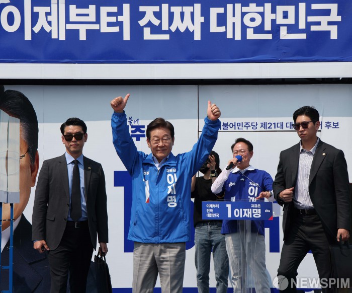 [춘천=뉴스핌] 정일구 기자 = 이재명 더불어민주당 대선 후보가 30일 오후 강원 춘천시 춘천역광장 집중유세에 참석해 지지를 호소하고 있다. 2025.05.30 mironj19@newspim.com