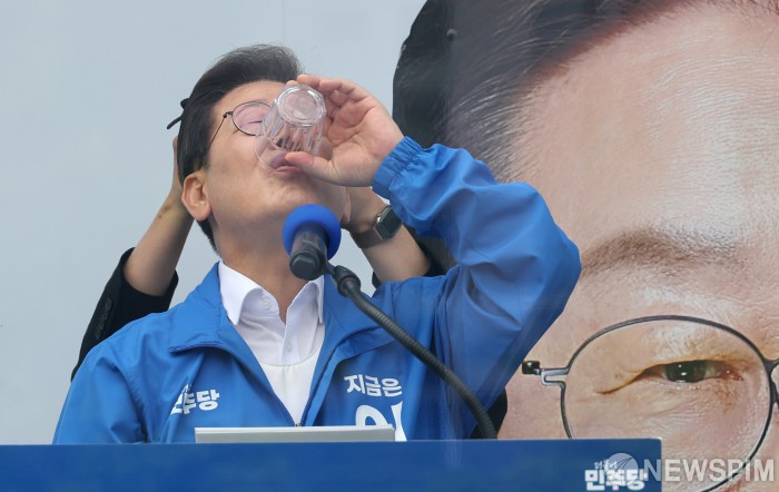 [평택=뉴스핌] 김학선 기자 = 이재명 더불어민주당 대선 후보가 31일 경기도 평택시 배다리 생태공원 앞에서 열린 유세에서 연설을 마치고 물을 마시고 있다. 2025.05.31 yooksa@newspim.com