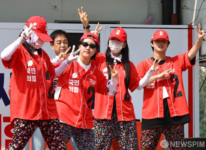 [수원=뉴스핌] 양윤모 기자 = 김문수 국민의힘 대선 후보 선거운동원들이 1일 경기도 수원컨벤션센터 광장에서 열린 유세에서 지지를 호소하고 있다. 2025.06.01 yym58@newspim.com