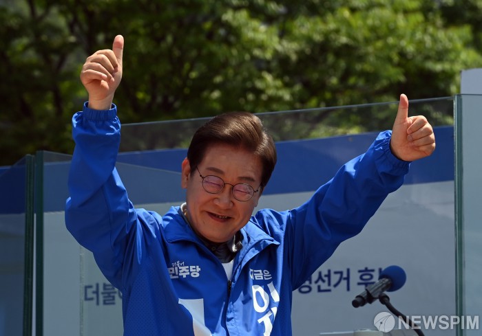 [안동=뉴스핌] 윤창빈 기자 = 이재명 더불어민주당 대선후보가 1일 경북 안동시 동부동 웅부공원에서 열린 유세에서 엄지손가락을 치켜들어 보이고 있다. 2025.06.01 pangbin@newspim.com