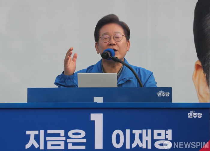 [부산=뉴스핌] 윤창빈 기자 = 이재명 더불어민주당 대선후보가 1일 부산역 광장에서 열린 집중유세에 참석, 유권자들의 지지를 호소하고 있다. 2025.06.01 pangbin@newspim.com