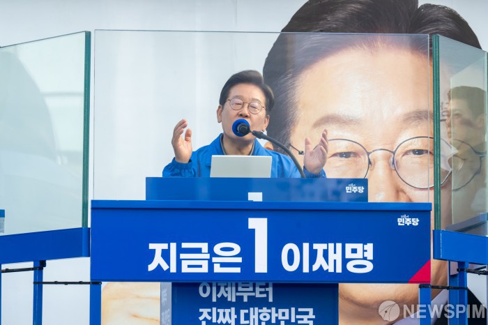 [부산=뉴스핌] 윤창빈 기자 = 이재명 더불어민주당 대선후보가 1일 부산역 광장에서 열린 집중유세에 참석, 유권자들의 지지를 호소하고 있다. 2025.06.01 pangbin@newspim.com