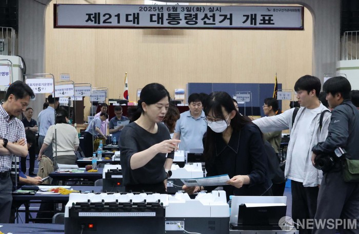 [서울=뉴스핌] 양윤모 기자 = 제21대 대통령선거 투표일을 하루 앞둔 2일 서울 용산구 신광여자고등학교에 마련된 개표소에서 선거관리위원회 직원들과 개표 사무원들이 투표지 분류기 모의시험을 하고 있다. 2025.06.02 yym58@newspim.com