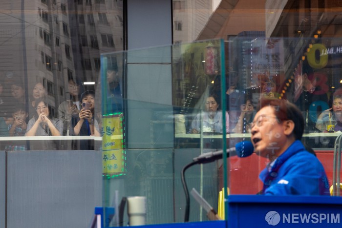 [서울=뉴스핌] 정일구 기자 = 이재명 더불어민주당 대선 후보 지지자들이 2일 경기 광명시 철산로데오 광장에서 열린 유세에서 이 후보를 응원하고 있다. 2025.06.02 mironj19@newspim.com