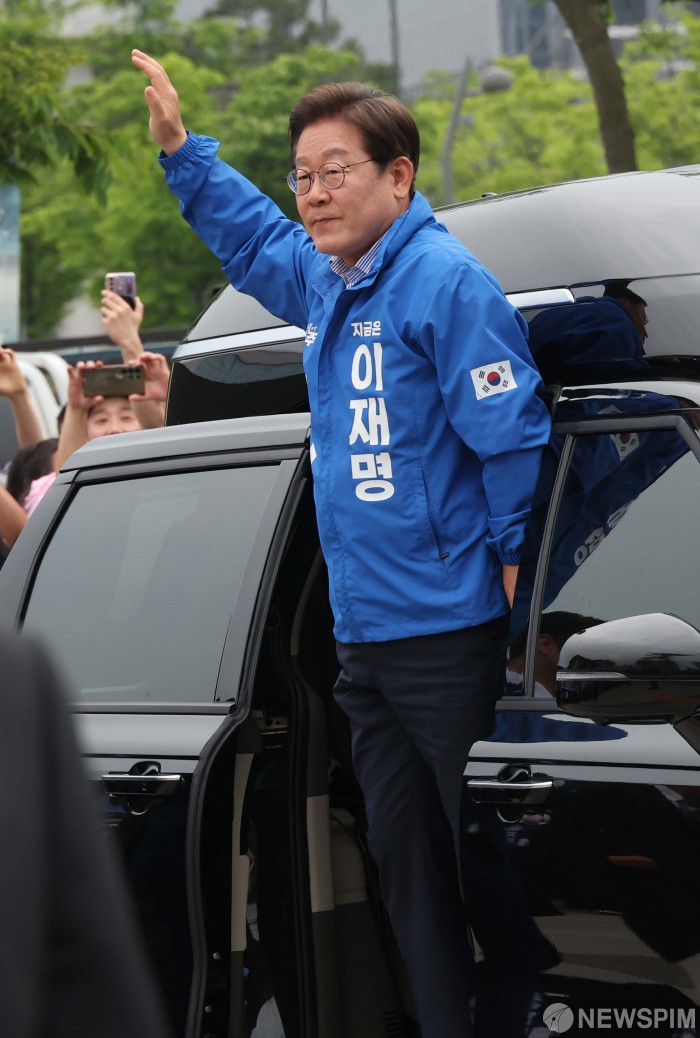 [서울=뉴스핌] 정일구 기자 = 더불어민주당 이재명 대선후보가 2일 서울 강서구 서울식물원 마곡나루광장에서 열린 강서구·양천구 유세에 도착해 손을 들어보이고 있다. 2025.06.02 mironj19@newspim.com