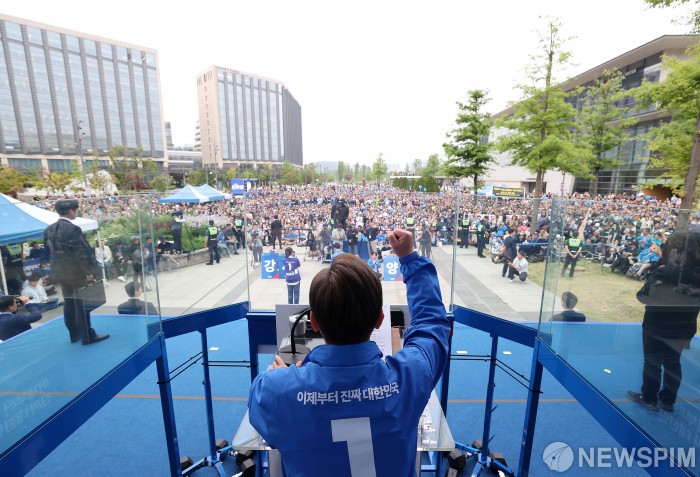 [서울=뉴스핌] 정일구 기자 = 이재명 더불어민주당 대선 후보가 2일 오후 서울 강서구 서울식물원 마곡나루광장에서 열린 강서구·양천구 유세에서 지지를 호소하고 있다. 2025.06.02 mironj19@newspim.com