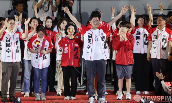 [서울=뉴스핌] 윤창빈 기자 = 김문수 국민의힘 대통령 후보가 2일 서울시청 광장에서 열린 "울려라 함성, 들어라 승리의 메아리" 피날레 유세에서 시민들에게 지지를 호소하고 있다. 2025.06.02 pangbin@newspim.com