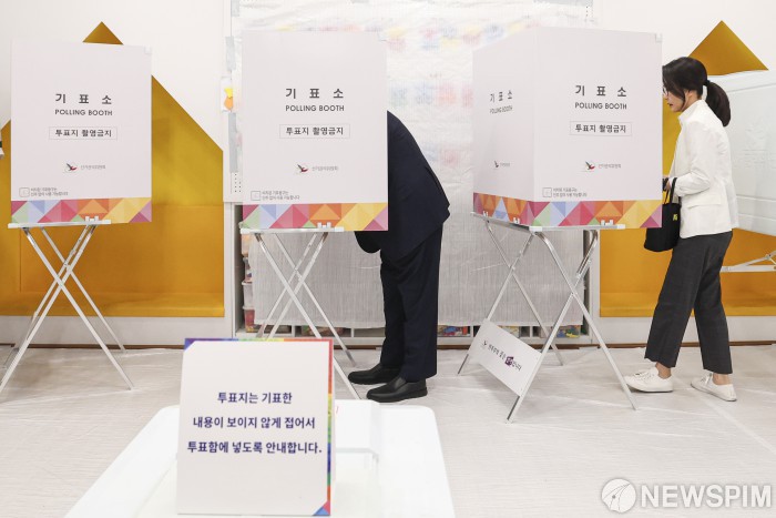 [서울=뉴스핌] 이길동 기자 = 윤석열 전 대통령 내외가 3일 오전 서울 서초구 원명초등학교에 마련된 서초4동제3투표소에서 투표를 하고 있다. 2025.06.03 gdlee@newspim.com