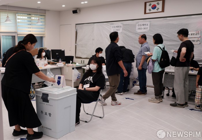 [서울=뉴스핌] 이길동 기자 = 21대 대통령선거 투표일인 3일 오전 서울 서초구 원명초등학교에 마련된 서초4동 제3투표소에서 시민들이 투표를 하고 있다.2025.06.03.gdlee@newspim.com