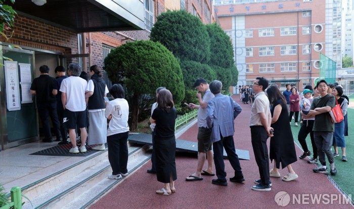 [서울=뉴스핌] 이길동 기자 = 21대 대통령선거 투표일인 3일 오전 서울 서초구 원명초등학교에 마련된 서초4동 제3투표소에 투표하려는 시민들로 붐비고 있다.2025.06.03.gdlee@newspim.com