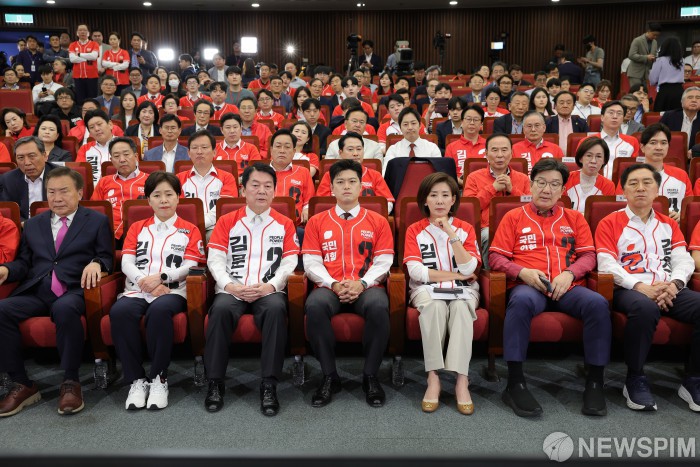 [서울=뉴스핌] 정일구 기자 = 3일 서울 여의도 국회 도서관에 마련된 국민의힘 개표 상황실에서 선대위원장들이 제21대 대통령 선거 방송3사 출구조사 결과를 보고 있다. 왼쪽부터 손학규, 양향자, 안철수, 김용태, 나경원, 권성동, 김기현. 2025.06.03 mironj19@newspim.com