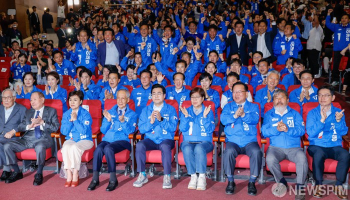[서울=뉴스핌] 윤창빈 기자 = 박찬대, 윤여준 더불어민주당 상임총괄선대위원장 등이 3일 오후 서울 여의도 국회의원회관 개표상황실에서 제21대 대통령선거 이재명 대통령 후보 51.7% 출구조사 결과에 손뼉치고 있다. 2025.06.03 pangbin@newspim.com