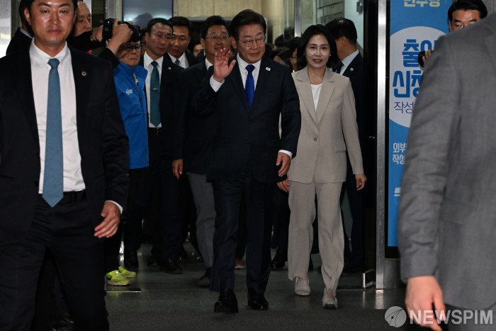 [서울=뉴스핌] 윤창빈 기자 = 이재명 더불어민주당 대통령 후보가 당선이 확실시된 가운데 4일 서울 여의도 더불어민주당 당사 방문을 마치고 민주당 개표방송 야외무대로 향하고 있다. 2025.06.04 pangbin@newspim.com