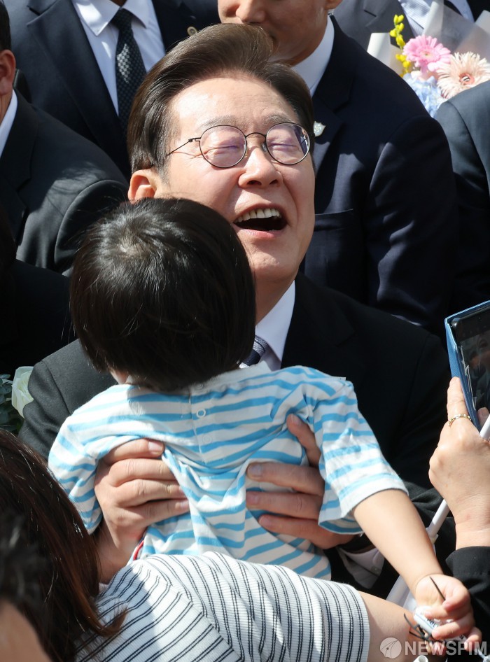 [인천=뉴스핌] 김학선 기자 = 이재명 대통령이 4일 인천 계양구 자택을 나서며 주민들과 인사 중 한 아이를 안아주고 있다. 2025.06.04 yooksa@newspim.com