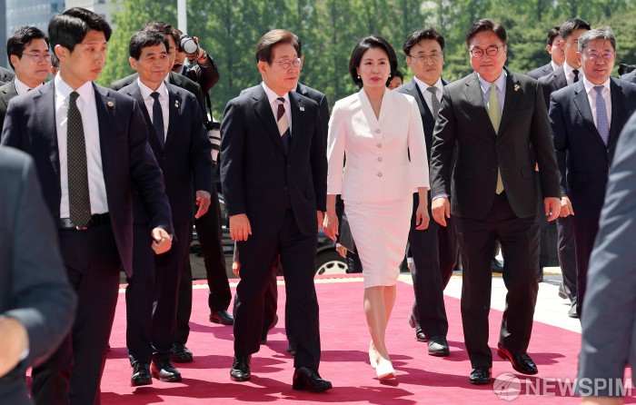 [서울=뉴스핌] 국회사진기자단 = 이재명 제21대 대한민국 대통령 내외가 영접 나온 우원식 국회의장과 함께 4일 취임 행사가 열리는 국회 본청으로 들어서고 있다. 2025.06.04 photo@newspim.com