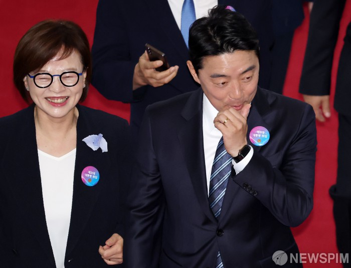 [서울=뉴스핌] 국회사진기자단 = 비서실장에 내정된 강훈식 의원이 4일 국회에서 열린 제21대 대통령 취임선서에 입장하고 있다. 2025.06.04 photo@newspim.com