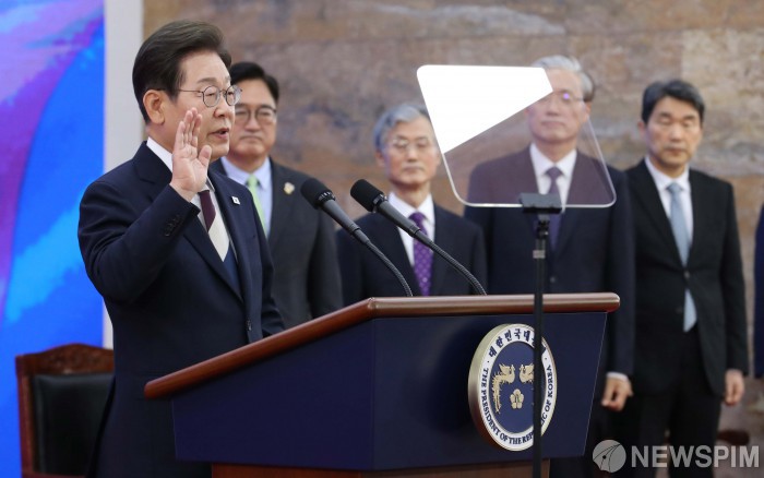 [서울=뉴스핌] 국회사진기자단 = 제21대 대통령 취임식이 열린 4일 오전 서울 여의도 국회에서 이재명 대통령이 취임식에서 선서를 하고 있다. 2025.06.04 photo@newspim.com