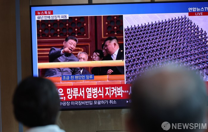 | [서울=뉴스핌] 김학선 기자 = 3일 서울 중구 서울역에 설치된 TV에 중계되는 중국 전승절 열병식 행사에서 시진핑 중국 국가주석과 김정은 북한 국무위원장이 톈안먼 망루에서 대화하는 장면이 나오고 있다. 2025.09.03 yooksa@newspim.com |
