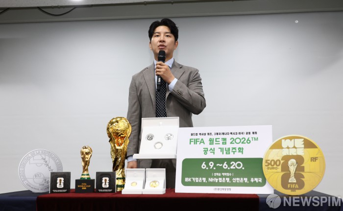 [서울=뉴스핌] 최지환 기자 = 박주호 해설위원이 5일 오전 서울 마포구 월드컵경기장에서 열린 FIFA 월드컵 2026 공식 기념주화 실물 공개 및 발표회에서 2026 공식 기념주화를 소개하고 있다. 2025.06.05 choipix16@newspim.com