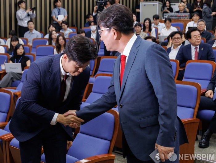 [서울=뉴스핌] 윤창빈 기자 = 김용태 국민의힘 비상대책위원장(왼쪽), 권성동 원내대표가 9일 오후 서울 여의도 국회에서 열린 의원총회에서 악수를 하고 있다. 2025.06.09 pangbin@newspim.com