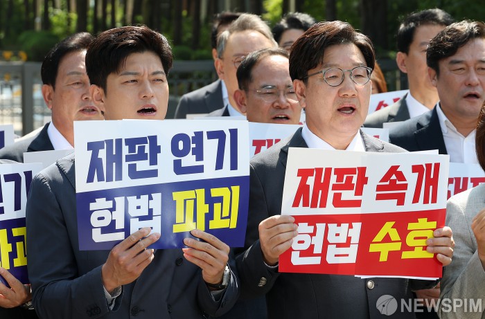 [서울=뉴스핌] 정일구 기자 = 김용태 국민의힘 비상대책위원장과 권성동 원내대표가 11일 오전 서울 서초구 서울고등법원 앞에서 열린 헌법 파괴 저지를 위한 현장 의원총회에서 손피켓을 들고 구호를 외치고 있다. 2025.06.11 mironj19@newspim.com