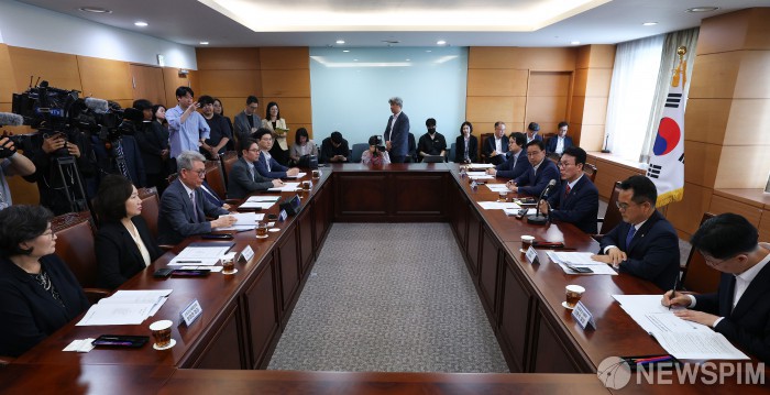 [서울=뉴스핌] 이길동 기자 = 김민석 국무총리 후보자가 13일 서울 종로구 통의동 금융감독연수원에 마련된 청문회 준비 사무실에서 열린 밥상물가 안정을 위한 경청 간담회에서 발언하고 있다.2025.06.13 gdlee@newspim.com