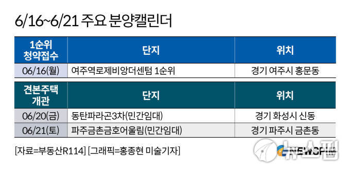 [서울=뉴스핌] 정영희 기자 = 15일 부동산 정보업체 '부동산R114'에 따르면 6월 셋째 주 전국 1개 단지 총 744가구(일반분양 744가구)가 분양을 시작한다. 경기 여주시 홍문동 '여주역로제비앙더센텀'에서 청약을 진행한다.