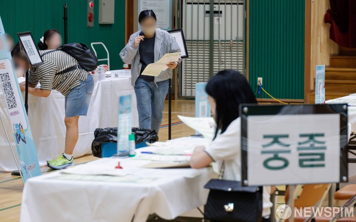 [서울=뉴스핌] 류기찬 인턴기자 = 2025년도 제2회 초·중·고 검정고시 원서접수일인 17일 오후 서울 동작구 서울공업고등학교 체육관에서 응시생들이 원서를 작성하고 있다. 2025.06.17 ryuchan0925@newspim.com