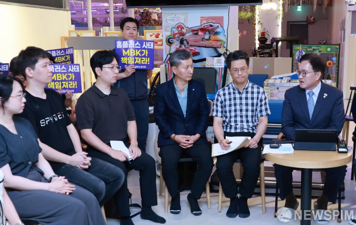 [서울=뉴스핌] 양윤모 기자 = 우원식 국회의장이 18일 오전 서울 노원구 홈플러스 중계점에서 홈플러스 입점주들을 만나 대화를 나누고 있다. 우 의장은 이날 홈플러스 입점주들을 만나 애로 사항을 듣고 해결 방안 모색에 나섰다. 2025.06.18 yym58@newspim.com