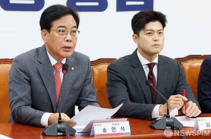 [서울=뉴스핌] 윤창빈 기자 = 송언석 국민의힘 원내대표가 19일 오전 서울 여의도 국회에서 열린 비리백화점 이재명 정부 인사청문회 대책회의에서 모두발언을 하고 있다. 2025.06.19 pangbin@newspim.com