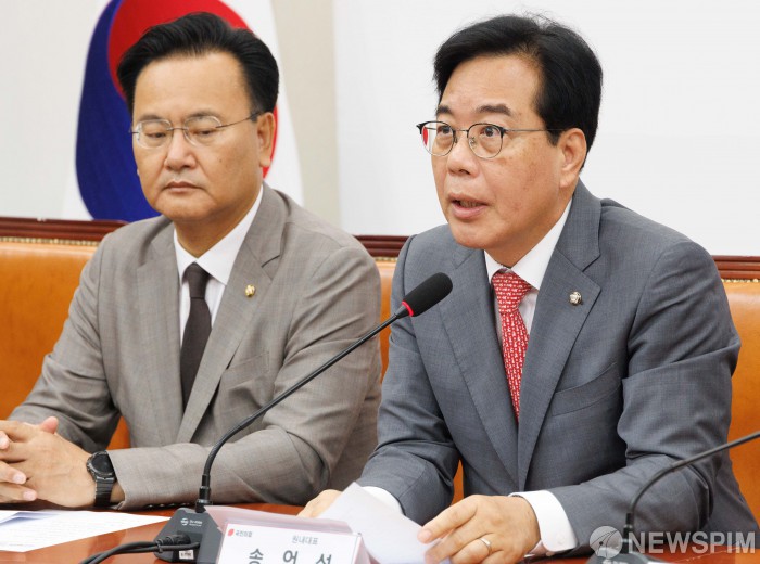 [서울=뉴스핌] 윤창빈 기자 = 송언석 국민의힘 원내대표가 19일 오전 서울 여의도 국회에서 열린 비리백화점 이재명 정부 인사청문회 대책회의에서 모두발언을 하고 있다. 2025.06.19 pangbin@newspim.com