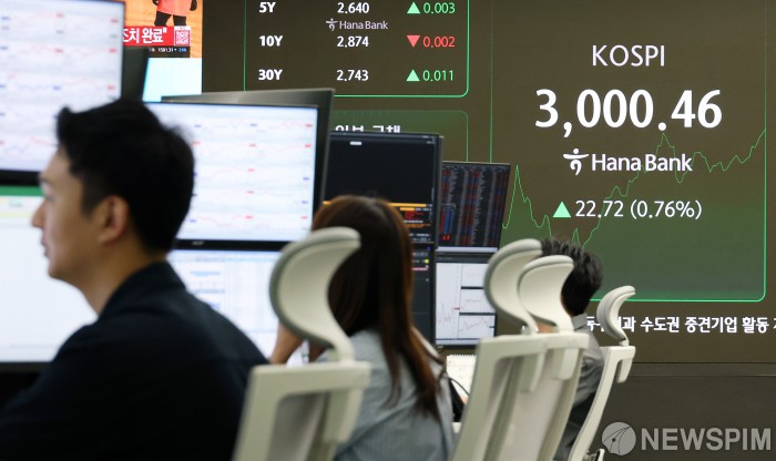 [서울=뉴스핌] 정일구 기자 = 코스피 지수가 장중 3000선을 돌파한 20일 오전 서울 중구 하나은행 딜링룸 전광판에 코스피가 3000.46을 나타내고 있다. 코스피 지수가 장중 3000선에 오른 건 코로나19 팬데믹 기간이었던 2022년 1월 3일(장중 3010.77) 이후 3년 5개월여 만이다. 2025.06.20 mironj19@newspim.com