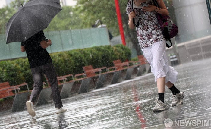 [서울=뉴스핌] 최지환 기자 = 본격적인 장마가 시작된 20일 오후 서울 영등포구 더현대 서울 인근에서 시민들이 우산을 쓰고 이동하고 있다. 2025.06.20 choipix16@newspim.com