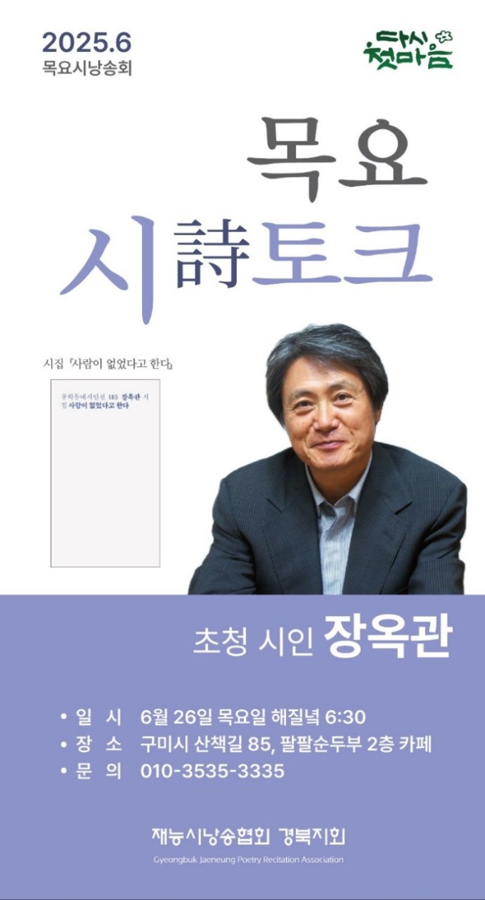 이번 시낭송회는 재능시낭송협회 경북지회가 주관하는 6월 '목요詩토크'의 일환으로 개최된다. 시집 '사람이 없었다고 한다'를 비롯해 깊이 있는 언어로 꾸준히 독자들에게 어필해온 장옥관 시인을 초청해 진행한다.