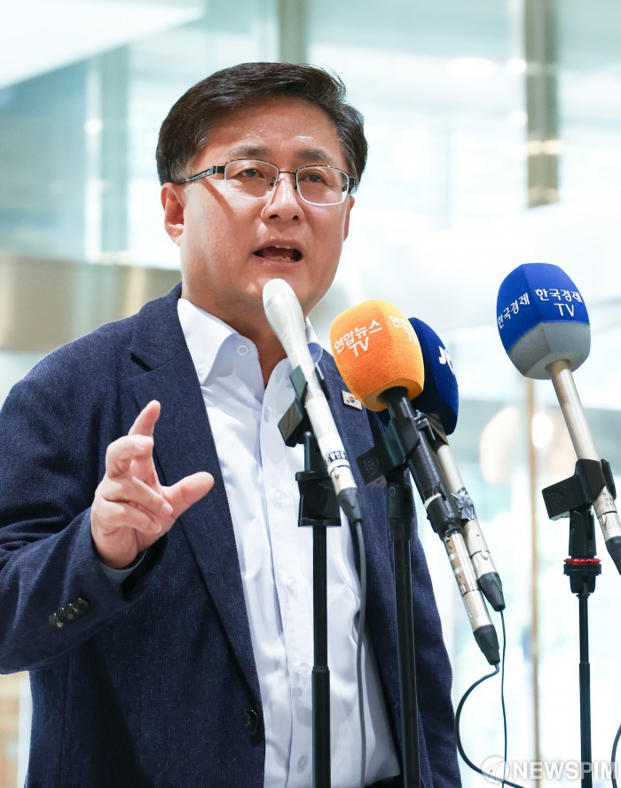 [서울=뉴스핌] 최지환 기자 = 김성환 환경부 장관 후보자가 24일 오전 서울 영등포구 이룸센터에 마련된 인사청문회 준비 사무실로 출근하며 취재진 질문에 답변하고 있다. 2025.06.24 choipix16@newspim.com