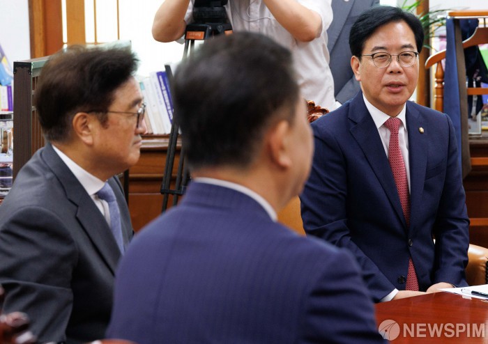 [서울=뉴스핌] 윤창빈 기자 = 송언석 국민의힘 원내대표가 24일 오전 서울 여의도 국회에서 우원식 국회의장 주재로 열린 양당 원내대표 회동에서 발언하고 있다. 2025.06.24 pangbin@newspim.com
