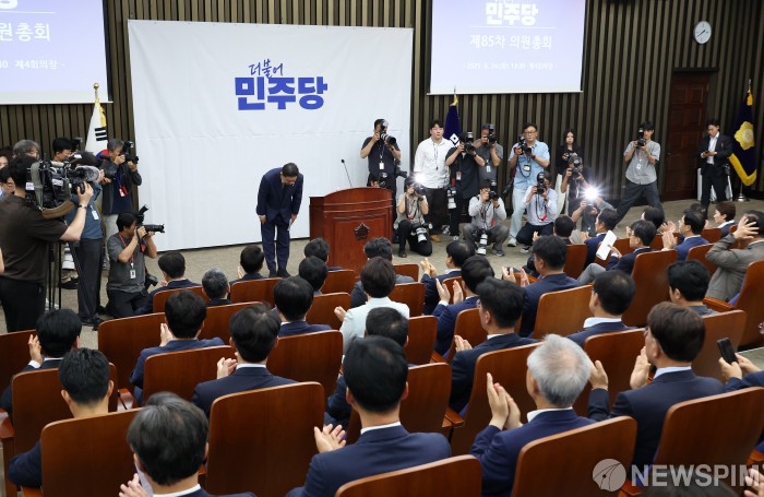 [서울=뉴스핌] 정일구 기자 = 김병기 더불어민주당 대표 직무대행 겸 원내대표가 24일 오후 서울 여의도 국회에서 열린 의원총회에서 모두발언을 마친 뒤 참석 의원들의 박수를 받고 있다. 2025.06.24 mironj19@newspim.com