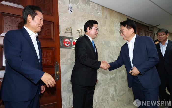 [서울=뉴스핌] 정일구 기자 = 더불어민주당 당대표 후보인 정청래(왼쪽), 박찬대 의원이 24일 오후 서울 여의도 국회에서 열린 의원총회에서 권칠승 의원 등 참석 의원들과 인사를 나누고 있다. 2025.06.24 mironj19@newspim.com