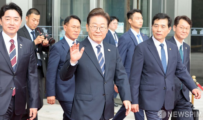 [서울=뉴스핌] 국회사진기자단 = 이재명 대통령이 26일 서울 여의도 국회에서 정부의 추가경정예산안 제출과 관련해 첫 시정연설을 마친 뒤 본청에서 나오고 있다. 2025.06.26 photo@newspim.com