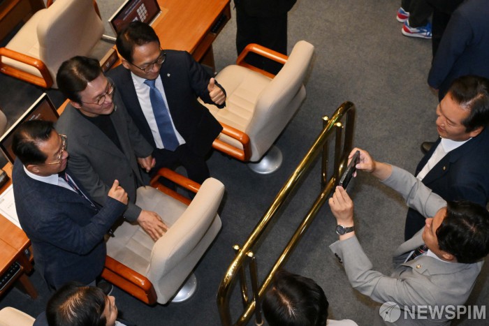 [서울=뉴스핌] 국회사진기자단 = 김민석 국무총리 후보자가 6일 국회 본회의장에서 더불어민주당 의원들과 기념촬영을 하고 있다. 2025.06.26 photo@newspim.com