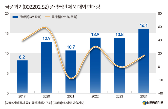 국신증권(國信證券)이 기업공시를 바탕으로 제공한 데이터에 따르면, 지난 한 해 금풍과기의 풍력터빈 판매 용량은 16.1 기가와트(GW)로 전년 동기 대비 17% 늘었다.