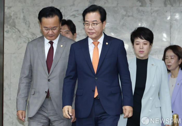 [서울=뉴스핌] 정일구 기자 = 송언석 국민의힘 원내대표가 27일 오전 서울 여의도 국회에서 열린 원내대책회의에 참석하고 있다. 2025.06.27 mironj19@newspim.com
