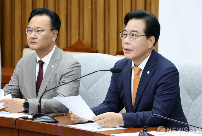 [서울=뉴스핌] 정일구 기자 = 송언석 국민의힘 원내대표가 27일 오전 서울 여의도 국회에서 열린 원내대책회의에서 모두발언을 하고 있다. 2025.06.27 mironj19@newspim.com