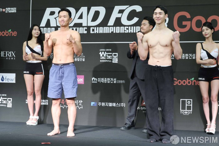 [서울=뉴스핌] 류기찬 인턴기자 = 윤형빈과 밴쯔가 27일 오후 서울 서대문구 스위스 그랜드 호텔에서 열린 ‘굽네 ROAD FC 073’ 계체량에서 포즈를 취하고 있다. 2025.06.27 ryuchan0925@newspim.com