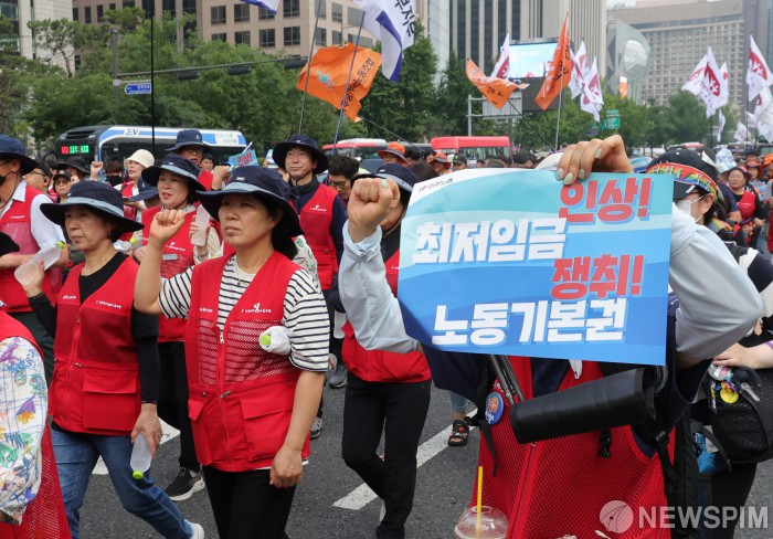 [서울=뉴스핌] 양윤모 기자 = 민주노총 공공운수노조 조합원들이 28일 오후 ‘최저임금인상·노동기본권 쟁취 결의대회'를 마치고 숭례문 앞에서 정부서울청사 앞으로 행진을 하고 있다. 2025.06.28 yym58@newspim.com
