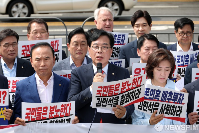[서울=뉴스핌] 정일구 기자 = 송언석 국민의힘 대표 권한대행 겸 원내대표가 1일 오전 서울 용산구 대통령실 앞에서 열린 현장 의원총회에서 발언을 하고 있다. 2025.07.01 mironj19@newspim.com