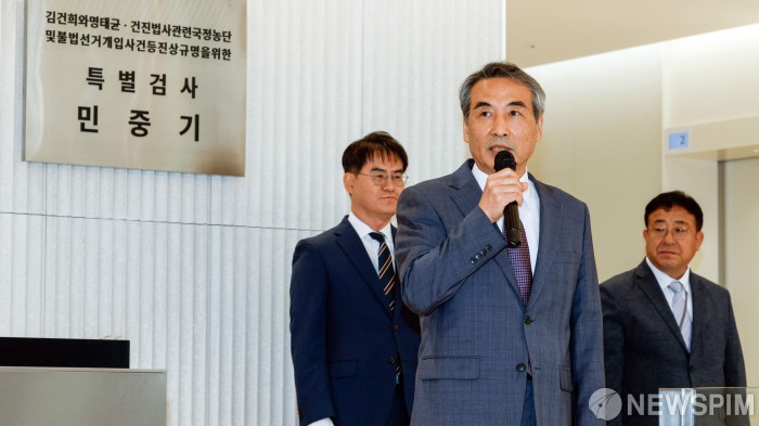 [서울=뉴스핌] 최지환 기자 = 윤석열 전 대통령의 부인 김건희 여사 의혹 관련 사건을 맡은 민중기 특별검사가 2일 오전 서울 종로구 KT광화문빌딩 웨스트에 마련된 특검 사무실에서 현판 제막을 마치고 발언하고 있다. 2025.07.02 choipix16@newspim.com
